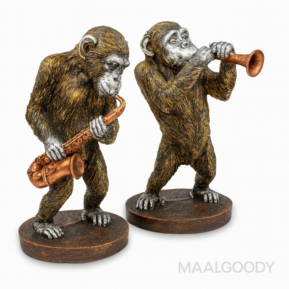 Celebrate the soul of jazz with our trumpet and saxophone-playing chimpanzees. These figurines are captured in mid-song, featuring a stunning contrast between their textured “bronze” fur and shimmering “silver” faces and hands. They stand on sturdy, circular bases, making them a perfect addition to a music room or a sophisticated library.
