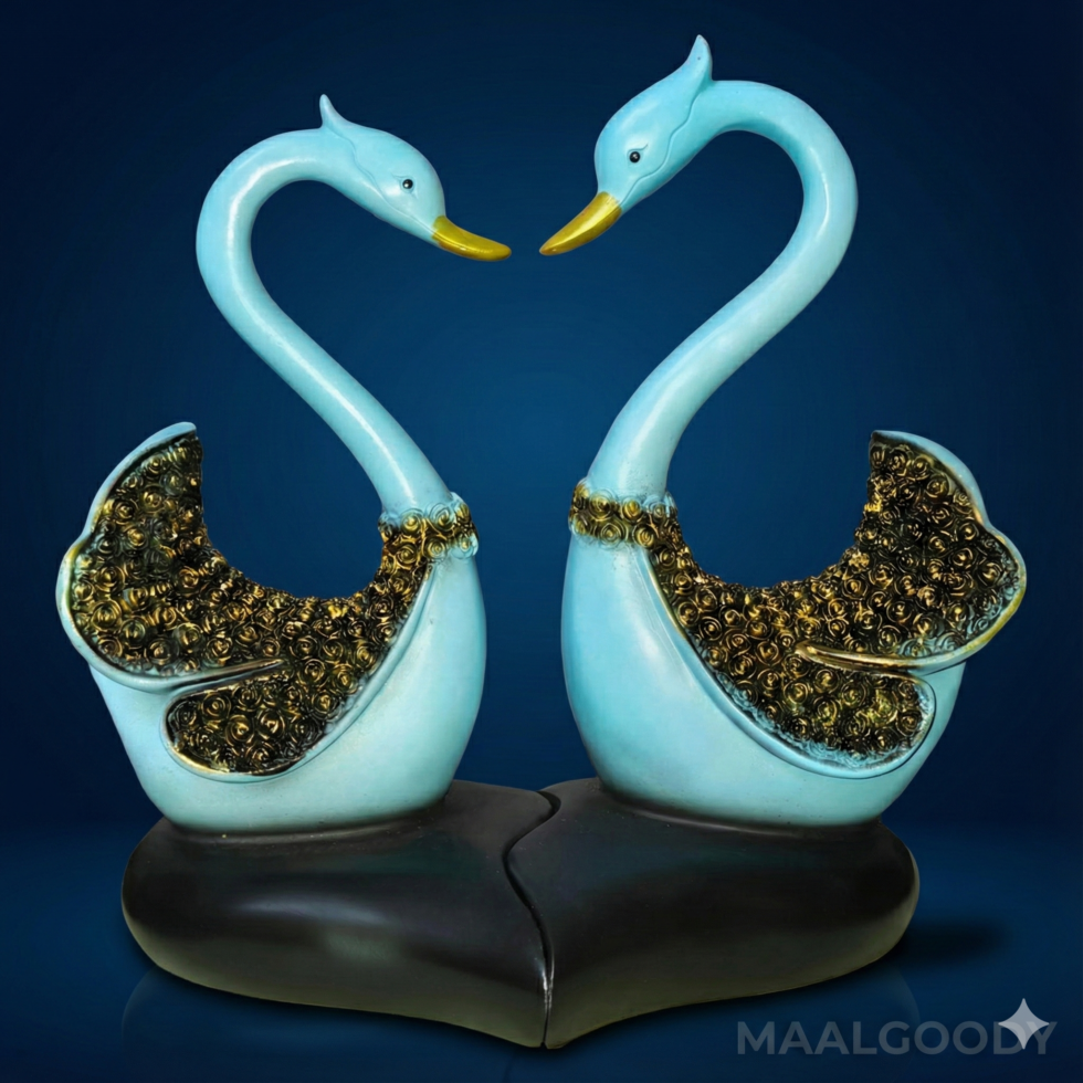 Transform your living space with this exquisite pair of decorative swans from MAALGODY. These graceful figurines feature a stunning turquoise blue finish complemented by intricate gold and black ornamental detailing on their wings, creating a luxurious and sophisticated aesthetic.