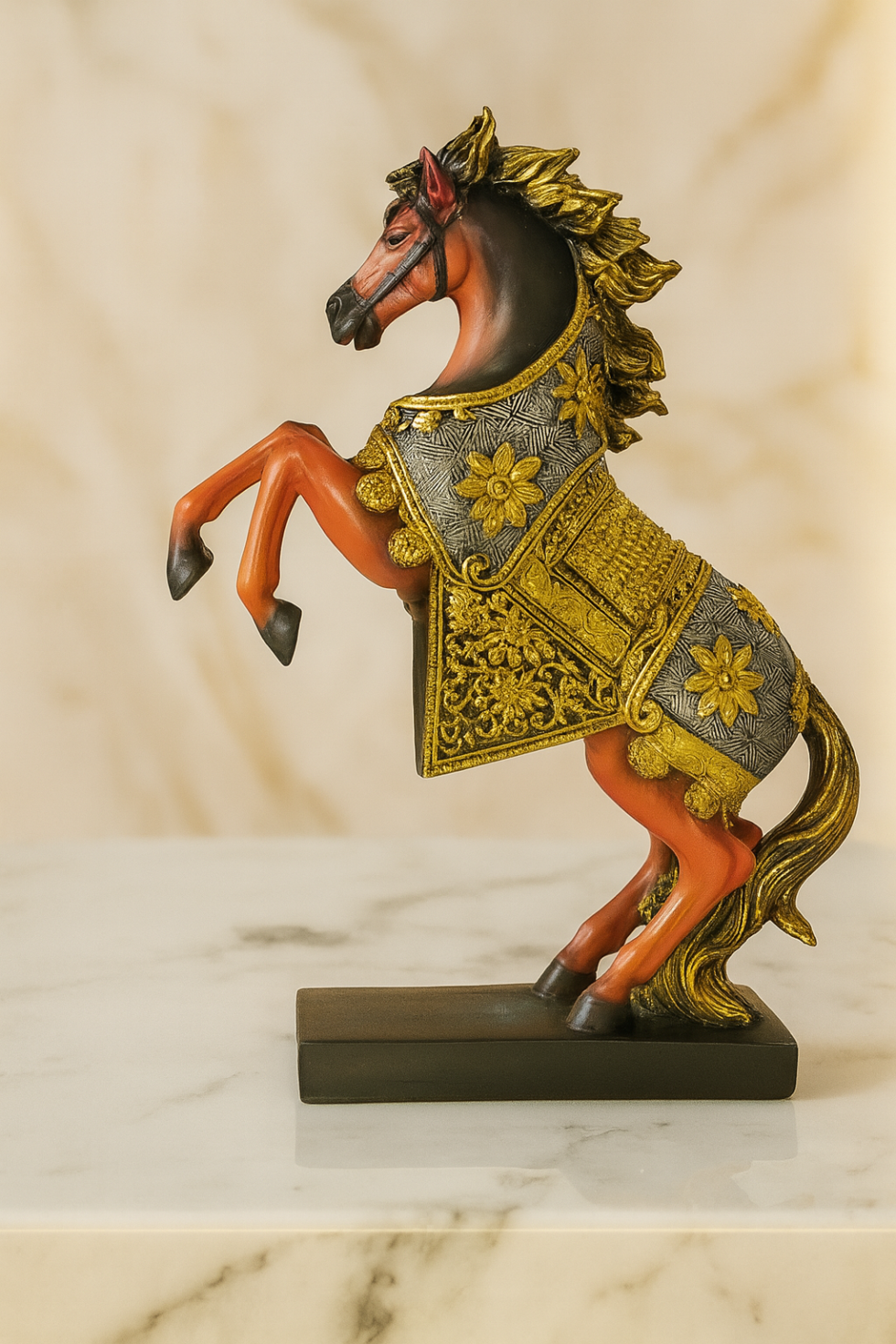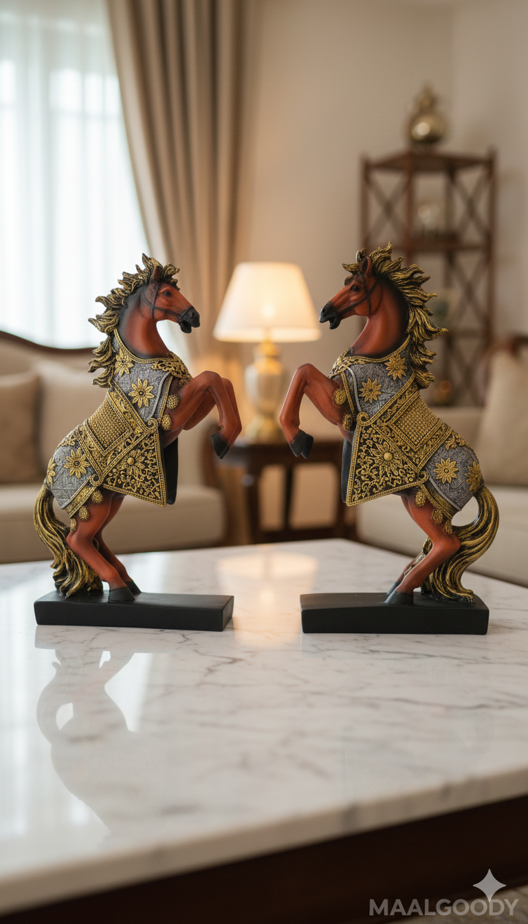 Elevate your home with MAALGOODY’s exquisite Rearing Horse Figurines Set. This stunning pair features intricate golden armor detailing on a rich red-orange finish, crafted from premium polyresin. Perfect for living rooms, offices, or as a thoughtful gift, these majestic horses symbolize success and prosperity in Vastu tradition. Each 10-inch figurine stands on a stable black base, creating an eye-catching display that blends traditional artistry with modern elegance. Transform any space into a royal sanctuary with this durable, easy-to-maintain decorative masterpiece.